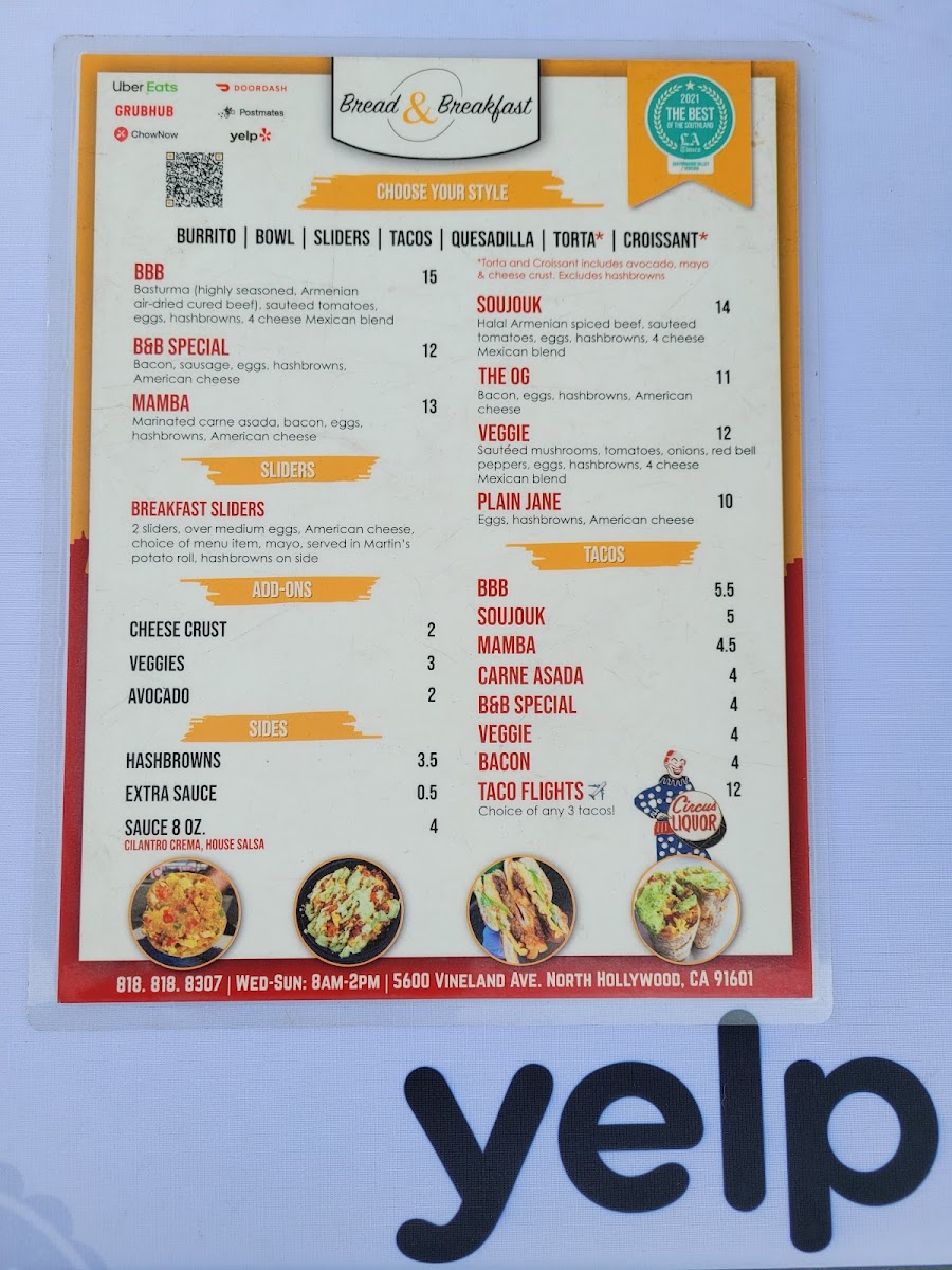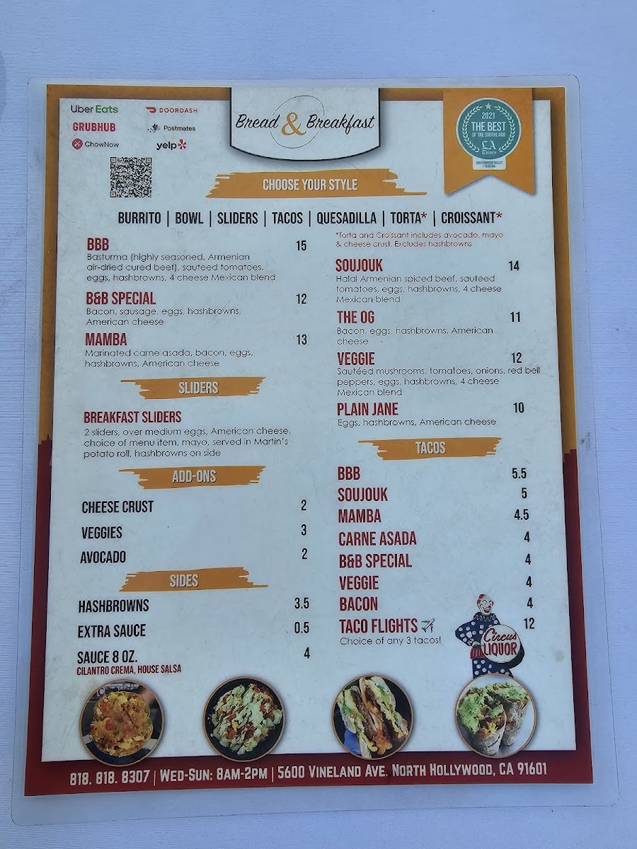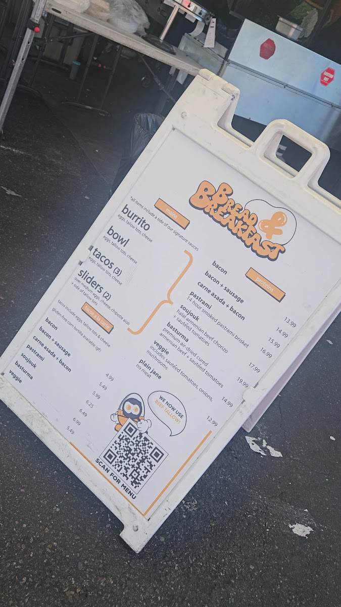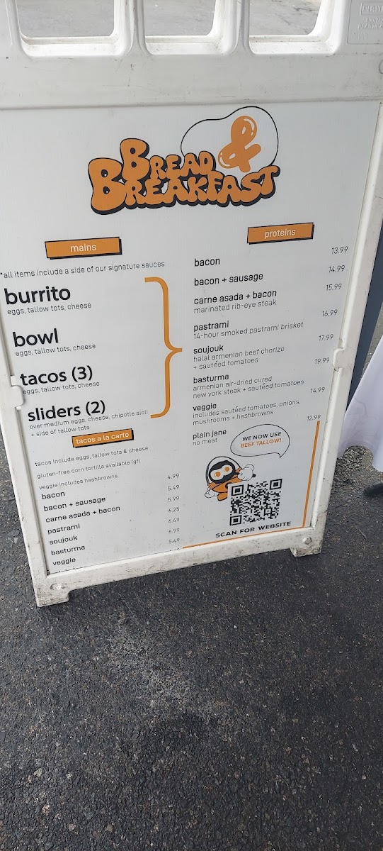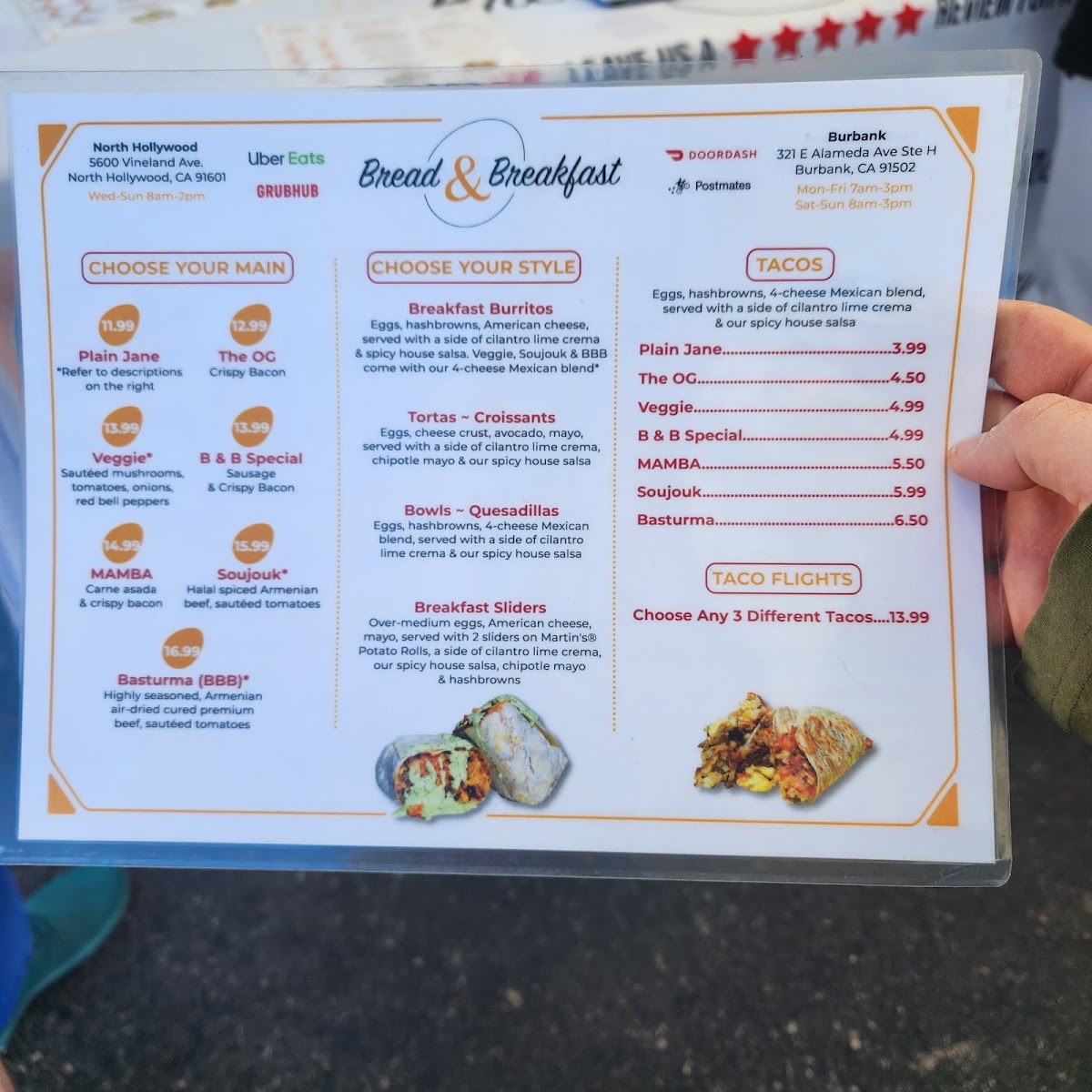 From a reviewer’s perspective, the menu at Bread & Breakfast - North Hollywood, located at 5600 Vineland Ave, North Hollywood, CA 91601, feels thoughtfully curated, focused on bold flavors and comforting, indulgent combinations. The taco selection stands out for its variety and personality, ranging from the smoky richness of Bacon Taco and Bacon & Sausage Taco to more distinctive options like Basturma Taco and Pastrami Taco, while the Veggie Taco offers a satisfying meat-free alternative without feeling like an afterthought. Complementing these are well-chosen sides such as Side Of Avocado, Side Of Tallow Tots, and Side Of Bacon, which add flexibility and balance to any order. The sauce lineup further elevates the experience, with choices like Extra Chipotle Aioli, Tub Of House Salsa (8 Oz), Extra Spicy Red Sauce, Cilantro Lime Crema Squeeze Bottle (10 Oz), and Extra Cilantro Crema, allowing diners to customize each bite to their preferred level of heat and creaminess. For heartier appetites, the bowls-especially Basturma Bowl, Bacon & Sausage Bowl, Carne Asada & Bacon Bowl, Veggie Bowl, and Plain Jane Bowl-deliver comfort and substance in equal measure. Burrito lovers are equally well served with options such as Basturma Burrito, Soujouk Burrito, Pastrami Burrito, Bacon & Sausage Burrito, and Carne Asada & Bacon Burrito, all designed to be filling and flavor-forward. Finally, the sliders section, featuring Soujouk Sliders, Carne Asada & Bacon Sliders, Veggie Sliders, Bacon Sliders, and Plain Jane Sliders, offers a fun, shareable way to sample the kitchen’s strengths. Overall, the menu successfully ties together comfort food influences with bold, savory ingredients, leaving a strong final impression of a restaurant that knows its identity and executes it with confidence.