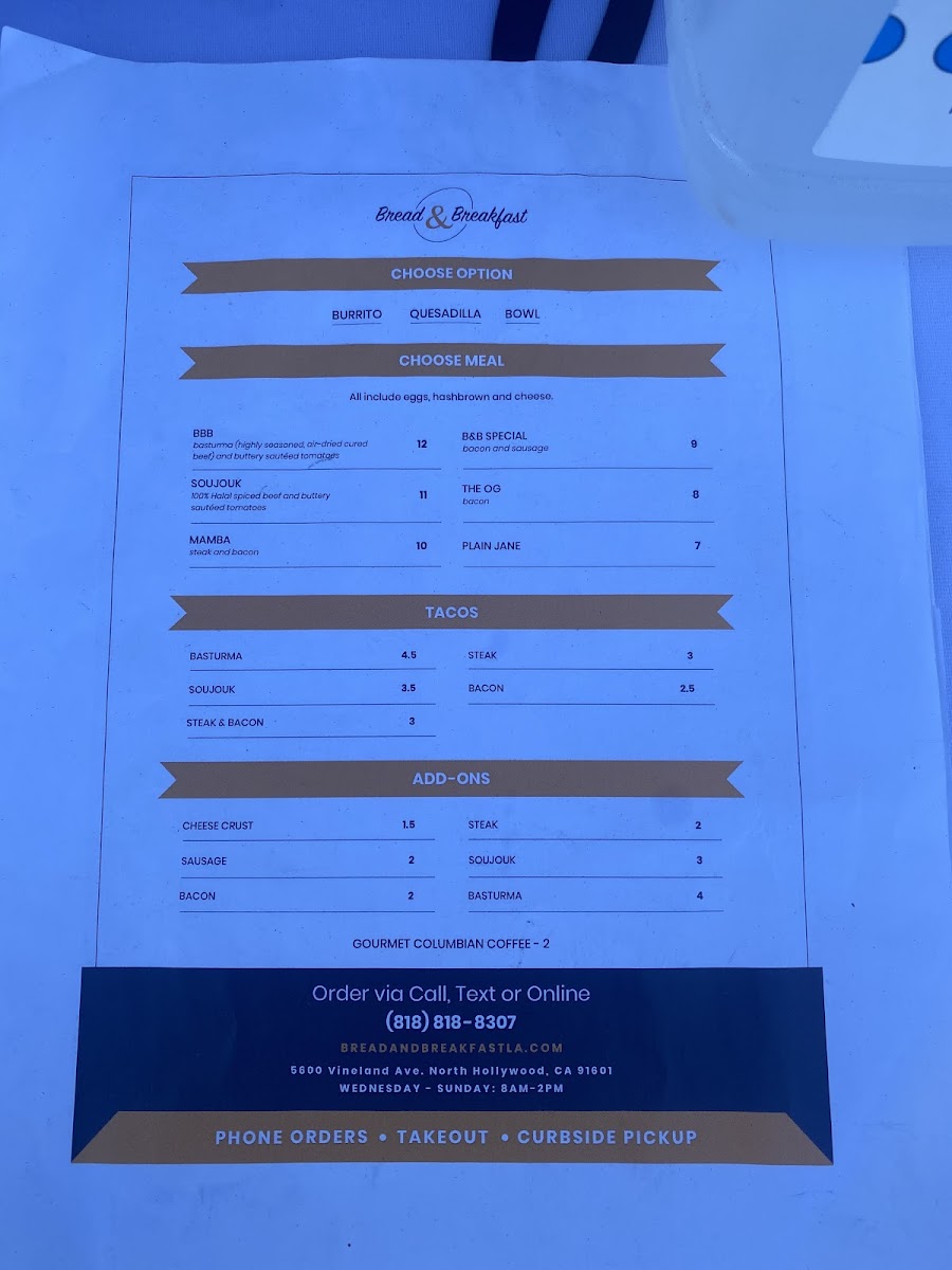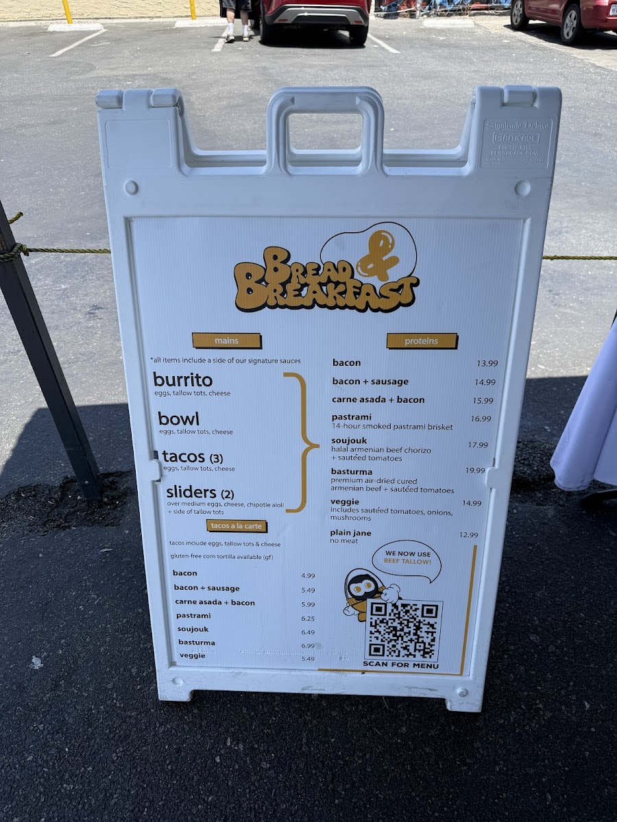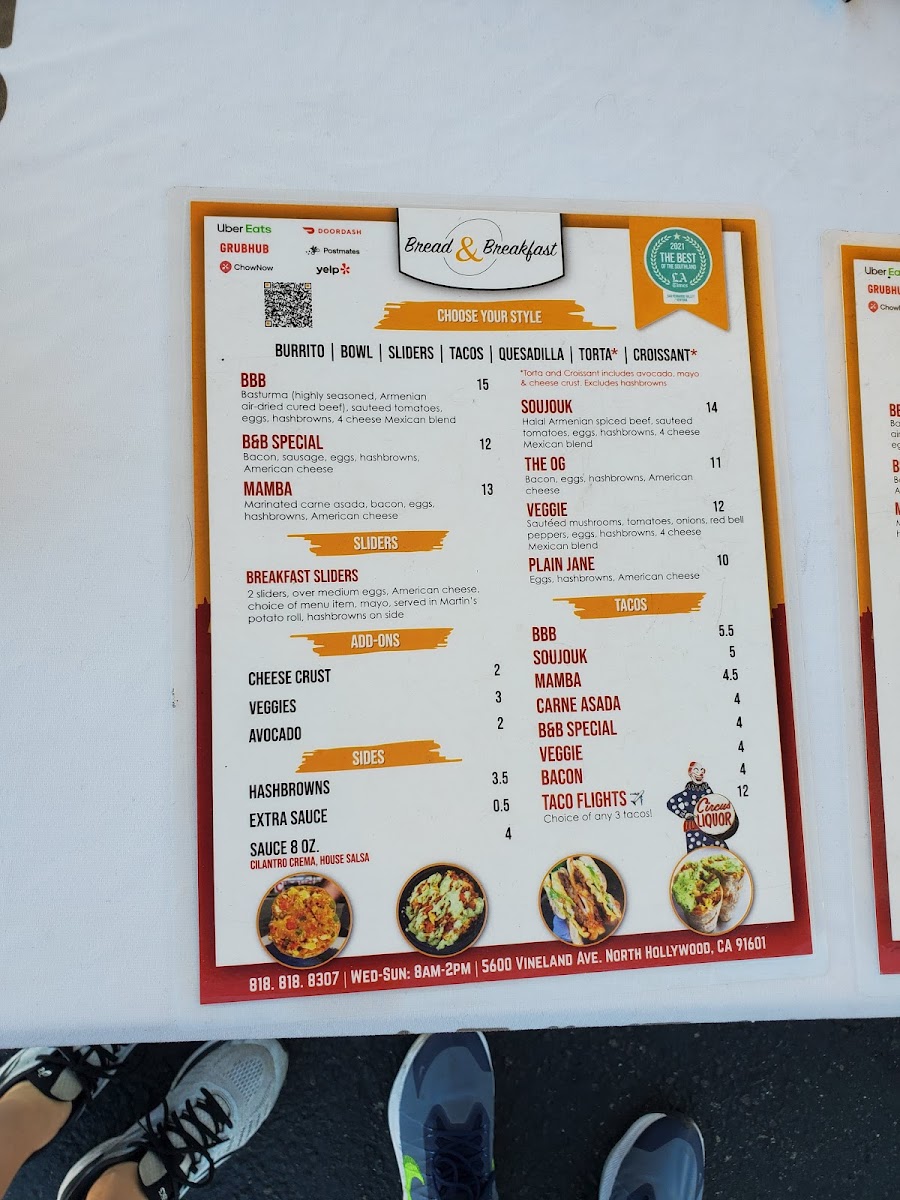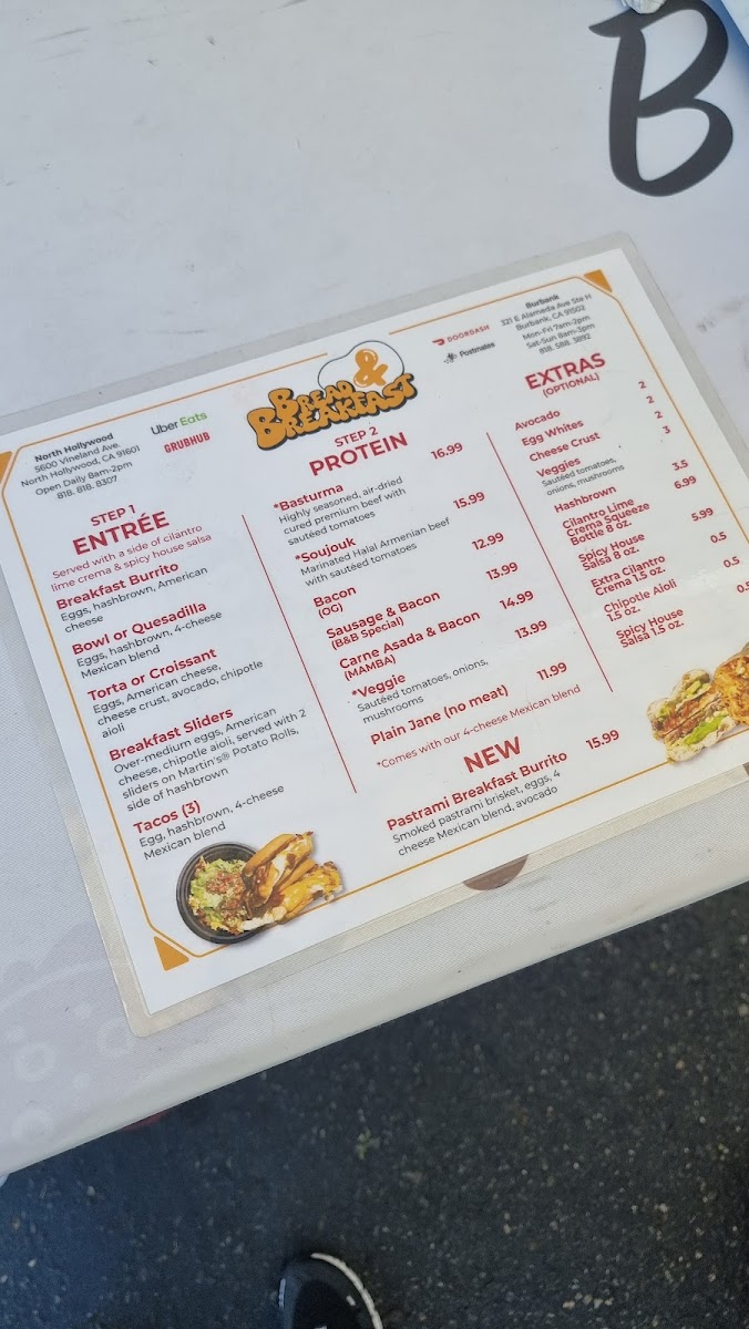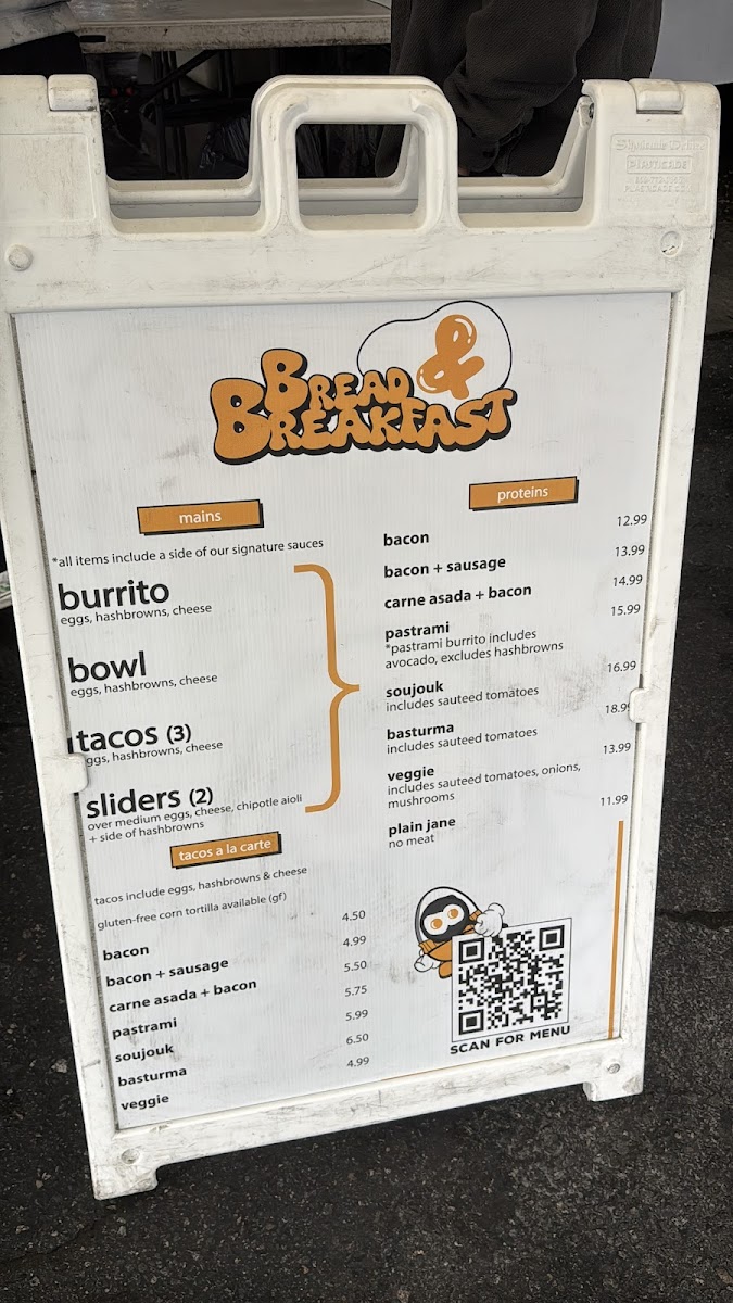 From a reviewer’s perspective, the menu at Bread & Breakfast - North Hollywood, located at 5600 Vineland Ave, North Hollywood, CA 91601, feels thoughtfully curated, focused on bold flavors and comforting, indulgent combinations. The taco selection stands out for its variety and personality, ranging from the smoky richness of Bacon Taco and Bacon & Sausage Taco to more distinctive options like Basturma Taco and Pastrami Taco, while the Veggie Taco offers a satisfying meat-free alternative without feeling like an afterthought. Complementing these are well-chosen sides such as Side Of Avocado, Side Of Tallow Tots, and Side Of Bacon, which add flexibility and balance to any order. The sauce lineup further elevates the experience, with choices like Extra Chipotle Aioli, Tub Of House Salsa (8 Oz), Extra Spicy Red Sauce, Cilantro Lime Crema Squeeze Bottle (10 Oz), and Extra Cilantro Crema, allowing diners to customize each bite to their preferred level of heat and creaminess. For heartier appetites, the bowls-especially Basturma Bowl, Bacon & Sausage Bowl, Carne Asada & Bacon Bowl, Veggie Bowl, and Plain Jane Bowl-deliver comfort and substance in equal measure. Burrito lovers are equally well served with options such as Basturma Burrito, Soujouk Burrito, Pastrami Burrito, Bacon & Sausage Burrito, and Carne Asada & Bacon Burrito, all designed to be filling and flavor-forward. Finally, the sliders section, featuring Soujouk Sliders, Carne Asada & Bacon Sliders, Veggie Sliders, Bacon Sliders, and Plain Jane Sliders, offers a fun, shareable way to sample the kitchen’s strengths. Overall, the menu successfully ties together comfort food influences with bold, savory ingredients, leaving a strong final impression of a restaurant that knows its identity and executes it with confidence.